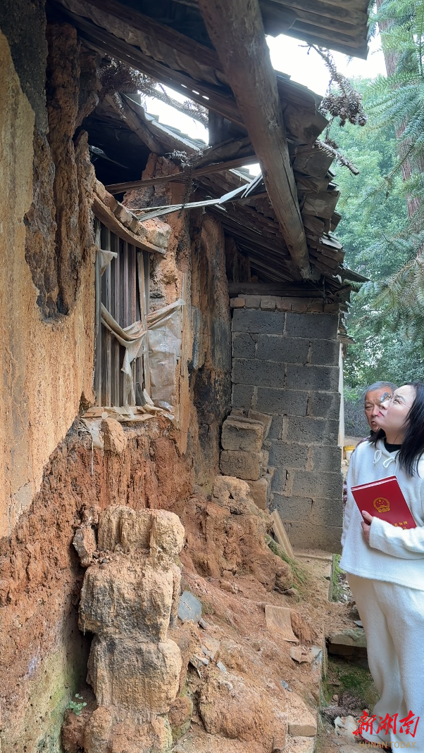 12月2日,在岳塘区板塘街道板塘村湖塘组,记者见到了村民张娜和其名下的百年老宅:土砖墙体布满裂缝,部分墙皮已经脱落,屋檐下堆积着雨水冲刷下来的泥块,几处屋顶明显下陷。